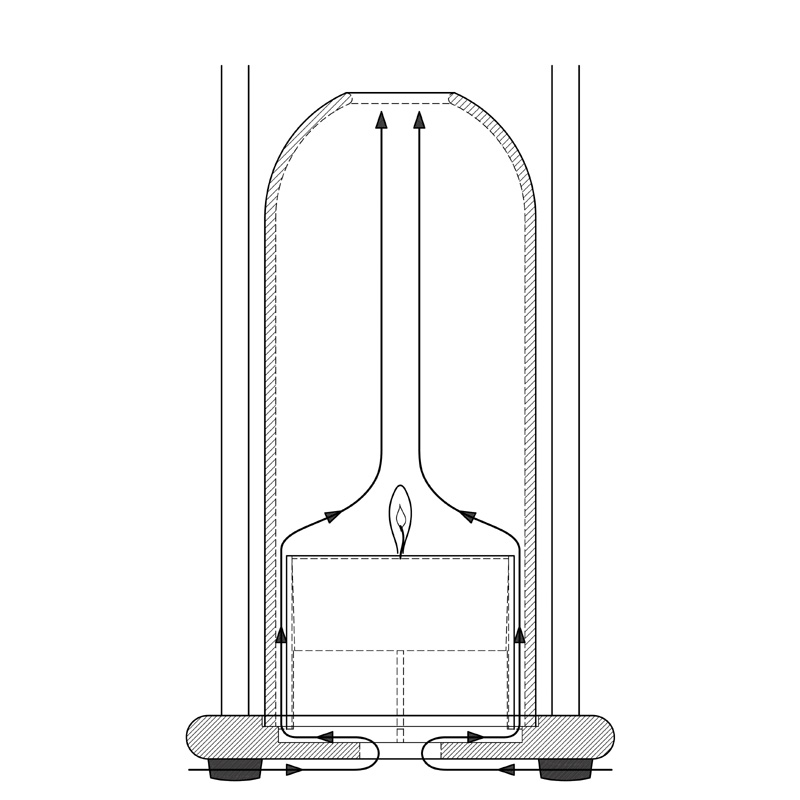 Es gibt andere Lampen dieser Art auf dem Markt, aber sie haben einen gemeinsamen Fehler: Sie brennen schlecht hinter Glas und flackern aufgrund unzureichender Sauerstoffzufuhr. Peter Seidelin Jessen wollte, dass „Fyrskib“ „flackerfrei“ brennt, mit einer rußfreien, stabilen Flamme, die angenehm anzuschauen ist. Dies wurde durch die Einführung eines Lufteinlasses am Boden der Lampe erreicht.